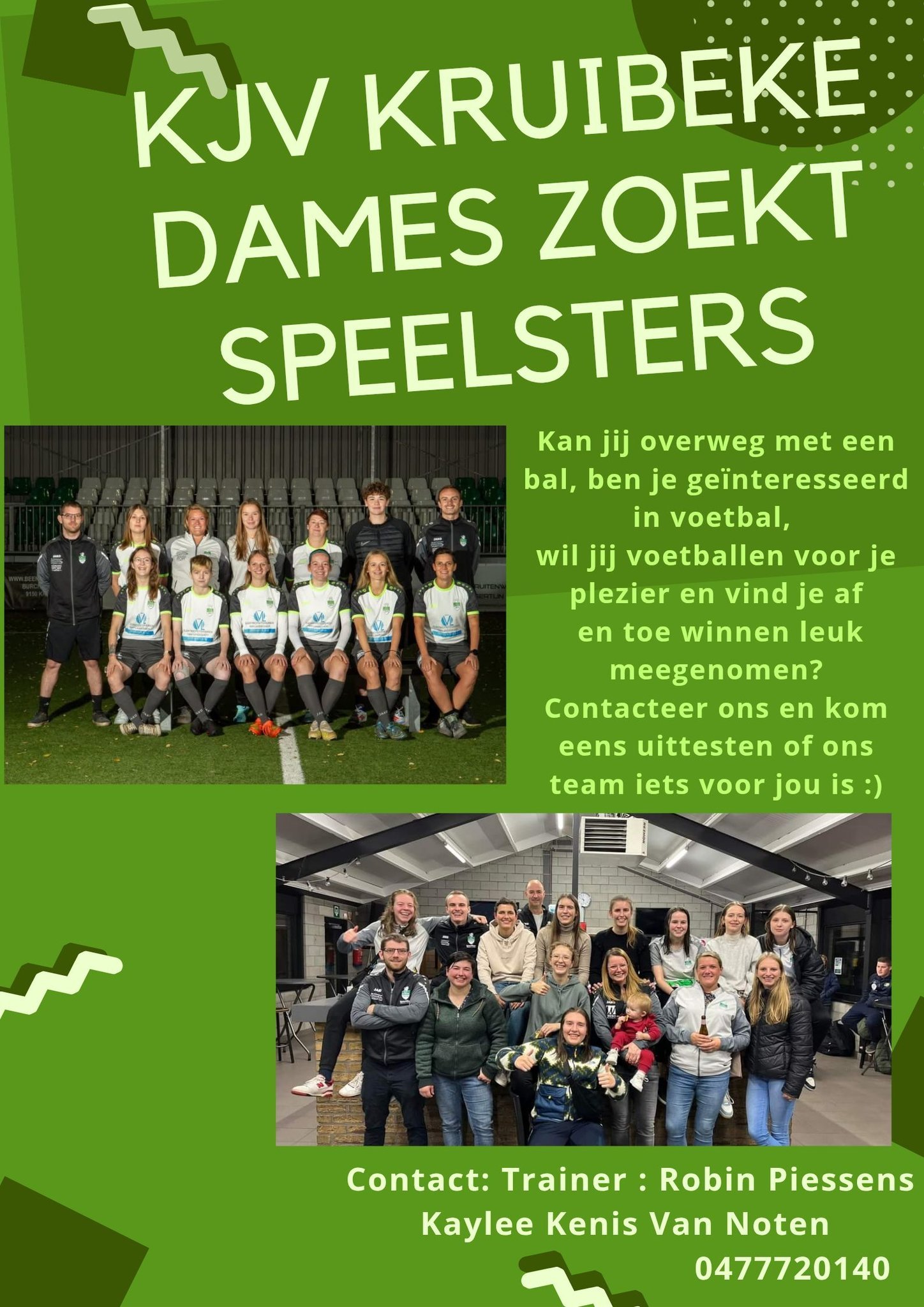 Voor komend seizoen gaan onze dames op zoek naar de nodige versterkingen, zowel kwalitatief als in de breedte, om volgend jaar opnieuw in Derde Provinciale aan te treden. Heb je interesse om te voetballen zonder enige prestatiedwang of druk? Bij JV Kruibeke ben je alvast welkom.